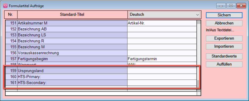 Angabe der Titel beim Anhängen von Zollinformationen an den Positionstext von Auslandsaufträgen